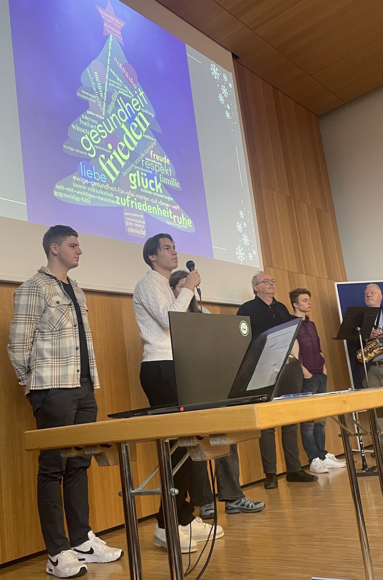 Dieses Jahr gestaltete die Fachschaft Religion um Christian Baier und Philipp Endmann gemeinsam mit Reli-Schülerinnen und Schülern, der SMV, Lehrer Friedhelm Kreß, der Schulleitung und einem Bläserensemble eine Andacht, in der es um Wünsche ging, die man sich nicht kaufen kann, wie soziale Kontakte, gegenseitige Hilfe und Frieden. Die Worte der Beteiligten regten die Schulfamilie zum Nachdenken und Handeln an. Auch das gemeinsame Singen von Weihnachtsliedern und der Gruß des Schulleiters Wolfgang Roll gehörten zum Auftakt in den letzten Schultag des alten Jahrs.